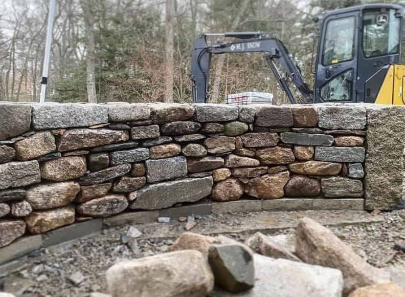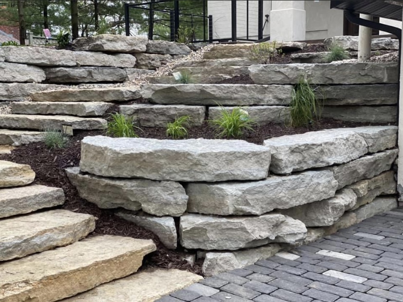 Segmental & natural stone retaining walls with proper base, geogrid, and water management.